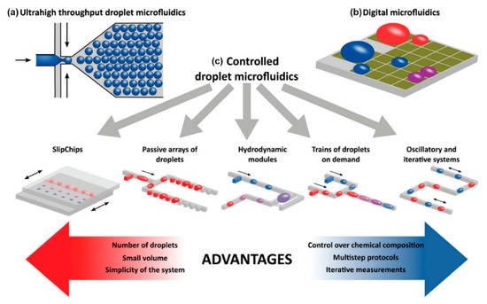 - Kaminski, T.S.; Garstecki, P. Controlled droplet microfluidic systems for multistep chemical and biological assays. Chem. Soc. Rev. 2017, 46, 6210–6226. [Google Scholar] [CrossRef]