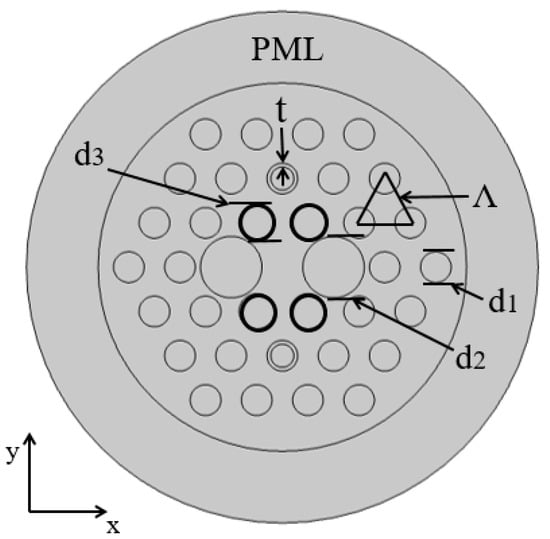 Figure 1 shows the PCF filter cross-section, the proposed PCF preform structure is based on the stacking of different capillaries and then draw PCF to the desired dimension. The cladding is in the form of a triangular lattice, and the pitch Λ in the fiber is 2 μm. A total of three sizes of air holes are included, which are d1, d2, and d3 as indicated in the figure, where d1 = 1.2 μm. The ring of the holes of t are coated with the gold film.