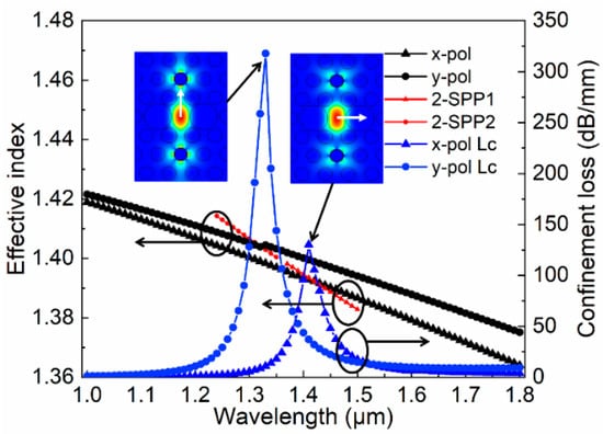 According to the literature [32,33], the SPR produced by the 2-SPP mode and the core FM is exactly located in the common communication windows and can produce a very strong resonance coupling effect, which is very suitable for polarization-dependent characteristic applications. In the PCF, the electric field distributions of SPP mode and FMs can be obtained from Figure 2. Through the numerical calculation, the dispersion relationship between the core FM and 2-SPP mode is obtained as depicted in Figure 3. It can be found that both the x- and y-pol state can resonant with different 2-SPP modes when the FM and 2-SPP mode are coupled, and the energy is exchanged to produce a very large dramatic change; as a result, two blue curve spikes emerge. We can also find that the coupling energy generated in the y-pol direction is significantly greater than that in the x-pol direction, which opens up possibilities for the proposed filter, so the design of the PCF-filter is performed.