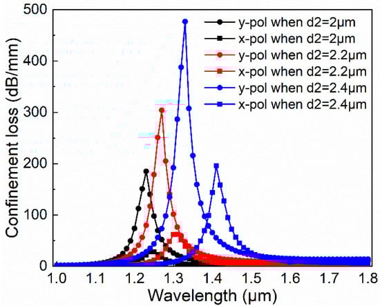 Firstly, we discuss the impact of d2. As shown in Figure 4, when other parameters remain constant (d1 = 1.2 μm, d3 is 1.2 μm, and t is 100 nm), we make d2 2 μm, 2.2 μm, and 2.4 μm, respectively. We can find that as the d2 increases, the corresponding x- and y-pol loss curves move toward the long-wavelength direction, the resonance peak value increases significantly, and the x- and y-pol resonance peak spacing increases under the same d2 condition. The d2 is larger than d1 the birefringence of this PCF is increased, but it does not mean that the larger d2, the better the performance. The results show that when d2 is 2.4μm, the curve in the y-pol direction no longer covers the x-pol direction, which is not conducive to generating broadband. Therefore, the intermediate value d2 = 2.2 μm is selected.