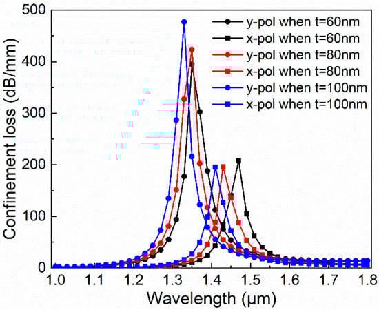 Secondly, we analyze the effect of gold film thickness t on the performance of the PCF-filter. The t values were taken at the nano-scale, 60 nm, 80 nm, and 100 nm, respectively. When d1 = 1.2 μm, d2 is 2.4 μm, and d3 is 1.2 μm. As shown in Figure 5, as the film thickness increases, the loss curve is blue-shifted, unlike the previous phenomenon, the energy in the y-pol direction increases. However, the energy in the x-pol direction is decreasing. In addition, the loss of peak spacing in both polarization directions is almost constant. We can fine-tune the performance of this filter based on the film thickness. When t is 100 nm, there is a larger difference in the peaks between the x- and y-pol direction, so we choose t = 100 nm for the next discussion.