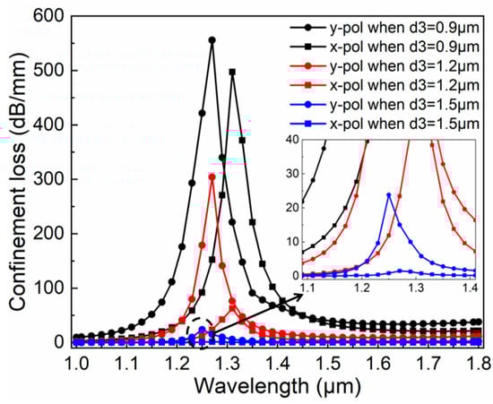 Thirdly, we take into account the effect of different d3 and make d3 0.9 μm, 1.2 μm, and 1.5 μm, respectively when d1 = 1.2 μm, d2 is 2.2 μm, and t is 100 nm. Figure 6 shows that because of the increase in d3, the loss peak is significantly reduced and the x- and y-pol peak spacing are slightly reduced. In addition, although the loss curves corresponding to different d3 values are significantly reduced, the difference between the x- and y-pol peaks is rather prominent. In the inset, it can be seen that when d3 = 1.5 μm, the loss peak in the y-pol direction is 23.4 dB/mm and the peak loss in the x-pol direction is 1.2 dB/mm. Although the energy level is not comparable to the other two cases, the energy difference in the two polarization directions is more than 10 times and the loss in the x-pol direction is less than that in the y-pol direction in the investigated wavelength range, which is suitable to produce effective polarization filter effect.