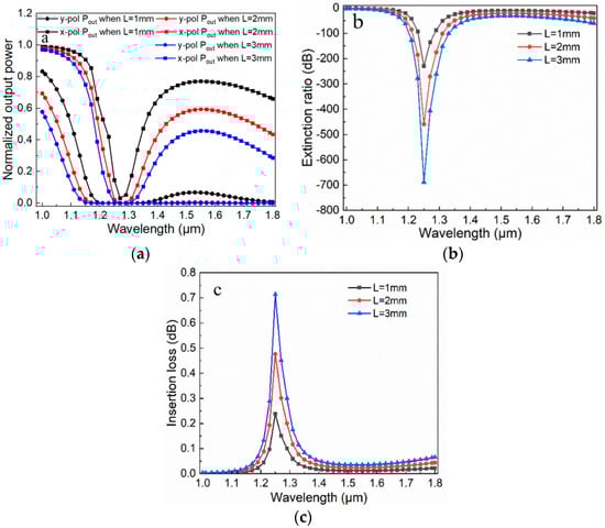 Performance parameters versus wavelength with different fiber lengths L for the proposed filter. (a) Normalized output power versus wavelength. (b) Extinction ratio versus wavelength. (c) Insertion loss versus wavelength.