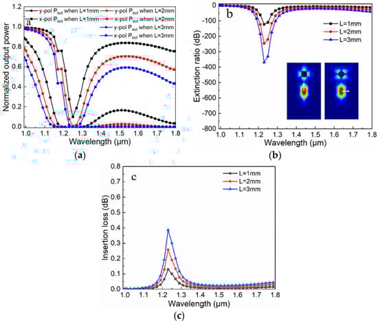 For NOP, all curves are distributed between 0 and 1, and the output power curve in the y-pol direction has two peaks. When the fiber length increases, the corresponding output power decreases overall. In the x-pol direction, the curve drops steeply and then flattens out, and the flatness increases as the length of the fiber increases. The corresponding ER curves are shown in Figure 7b; we have found that when the fiber length L increases, the ER increases and the extinction degree becomes higher. When L is 3 mm, ER can reach −698 dB. For IL, as the increment of L, the IL value increases. However, IL needs to be reduced as much as possible in this device, so we choose L = 2 mm as a compromise. When the fiber length is 2 mm, the ER peak can reach −478 dB. If the ER can be controlled below −20 dB, it means that the x- and y-pol modes can be divided well. According to this criterion, a surprising result can be found that the filter has a 750 nm bandwidth which covers the two communication windows of 1.31 and 1.55 μm (1.05–1.8μm). Besides, IL is 0.11 dB at 1.31 μm and 0.04 dB at 1.55 μm. Therefore, a broadband PCF polarization filter with compactness, high ER, broad bandwidth, and low IL can be achieved. In addition, the single-ring structure filter is also investigated as shown in Figure 8. The principles of two filters are similar, according to the mode field shown in Figure 8b, the single-ring structure will have a dispersion relationship similar to that in Figure 3, then the three performance parameters can be achieved. When L is 2 mm, the maximum ER is −256 dB, the bandwidth is about 530 nm (1.12–1.65 μm), and IL is below 0.1 dB at 1.31 μm and 1.55 μm. Overall, the proposed filter with dual-ring gold layer has a better performance.