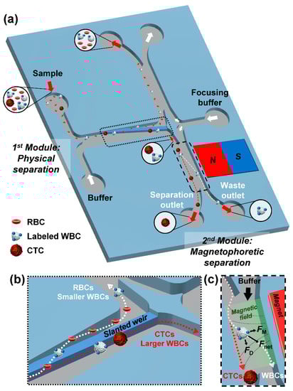 In this paper, we report on a microfluidic separation device that integrated an immunoaffinity-based negative enrichment method, which removed labeled WBCs with a physical separation method, and therefore isolated CTCs. By adding a method to remove WBCs with overlapping physical characteristics, it was possible to alleviate the required pressure difference levels for physical separation of CTCs, leading to higher levels of separation. We also analyzed the competition between the drag and magnetic forces acting on the magnetically labeled WBCs and were able to optimize the conditions to achieve their continuous removal.