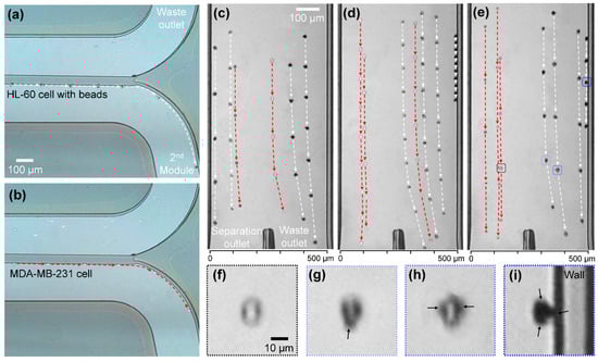 Demonstration of cell separation. (a) HL-60 cell and (b) MDA-MB-231 cell guided by the slanted weir in the physical separation module. HL-60 cells (white arrow) and MDA-MB-231 cells (red arrow) passing through the magnetophoretic separation module under various focusing buffer flow rates and magnetic field strength conditions of (c) 3 mL/h and 0 mT, (d) 3 mL/h and 20 mT, and (e) 5 mL/h and 20 mT. (f–i) Enlarged images of cells during separation from Figure 2e. (f) A separating MDA-MB-231 cell without a bead and separating HL-60 cells with (g) one bead (black arrow), (h) two beads, and (i) three beads.