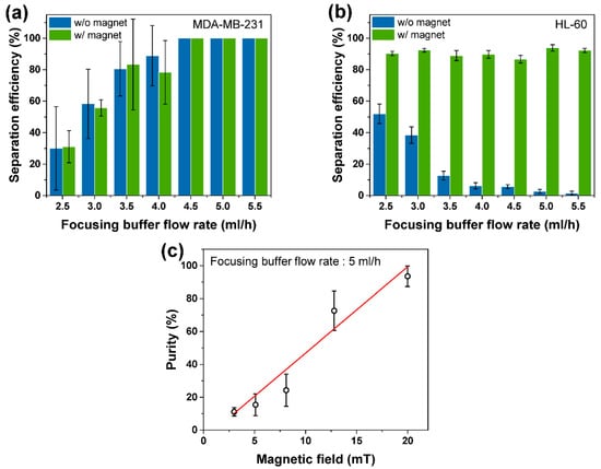 Separation efficiencies of (a) MDA-MB-231 cells and (b) HL-60 cells according to the focusing buffer flow rate. The applied magnetic field strength was 20 mT. (c) Purity at the separation outlet according to the magnetic field strength.