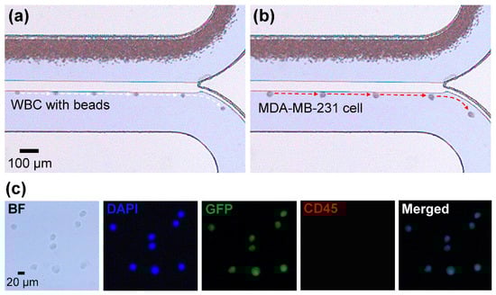Physical separation of (a) a WBC and (b) an MDA-MB-231 cell from whole blood by the slanted weir. (c) Bright field and fluorescence images of MDA-MB-231 cells collected from the separation outlet. Cancer cells were distinguished from WBCs by immunofluorescent staining of DAPI for nucleus, GFP for cancer, and CD45 for WBC. The cells that express DAPI+/GFP+/CD45− phenotype were considered to be MDA-MB-231 cells.