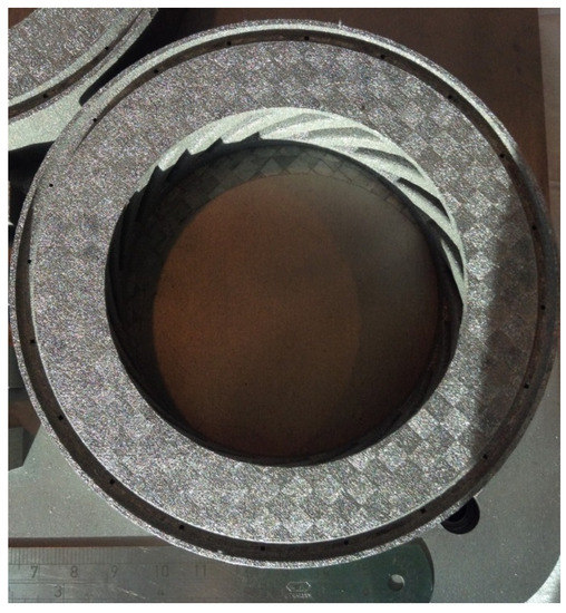 After pickling using nitric acid, the steel tooling was removed and the netshape blisk was produced using Fe-tooling SLM/HIP, as shown in Figure 11. The fine risers were all filled with powder and became solid CM247LC pins connecting the blades and groove ring. The top and bottom of the disk sections were near to flat. Therefore, the can, including each blade, was filled with powder successfully before HIPping and consolidated into the complete blisk without any defects.