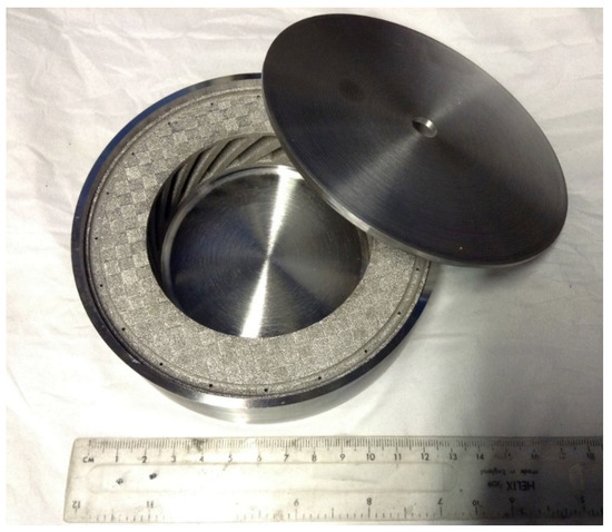 - After vacuum testing, the assembled parts were filled with CM247LC powder with a size range of 0–150 µm. The container was filled on a vibrating table to ensure good filling of the cavities and high, reproducible packing density. The filled can was degassed overnight and then sealed by crimping and welding. The sealed can was then HIPped at 1260 °C for 2 h.