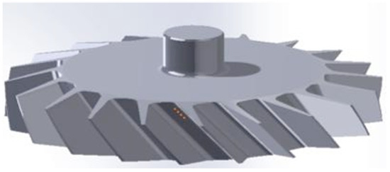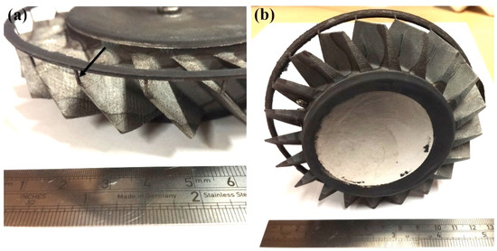 The second (oversized) blisk was successfully fabricated, as shown in Figure 13a. Although it was entirely produced from powder like the second blisk, the top and bottom of the disk were nearly completely flat. A further GOM optical 3D scan was carried out, as shown in Figure 13b. It can be clearly seen that the blades are thicker than the first blisk, shown in Figure 11.