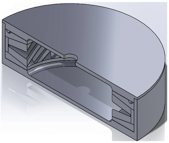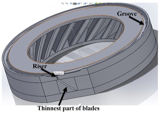 The ‘riser’ was located at the thinnest part of the blade, with one for each blade, to ensure each cavity was filled with powder evenly; an extra groove ring was added to connect the ‘risers’ to provide a small powder reservoir to feed the cavities if required, as seen in Figure 7. The final assembled can design is shown in Figure 8. The filling tube was added at the welding stage.