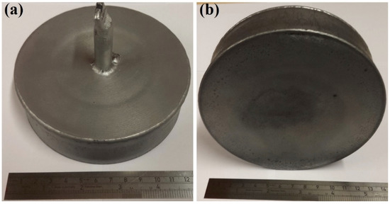 Images of the powder canister after HIPping: (a) top view of the component, showing a shallow sink mark in the middle part of the component where the disk is located; (b) the bottom side of the canister showing even shrinkages towards to the centre and also a shallow sink mark on the bottom of the canister.