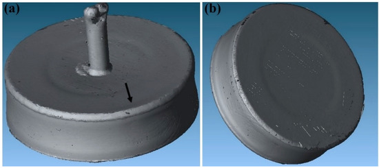 Images of the components after HIPping, as scanned using a Faro laser scanner: (a) top view of the component showing a shallow sink mark in the middle part and a small concave area indicated in the image due to less powder filled into the groove; (b) clearer contraction evenly towards the centre of the components and a shallow sink mark on the bottom of the canister.