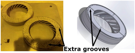One of the concerns associated with HIPping is the need to consider the degree of shrinkage associated with powder consolidation. To assess the shrinkage of the first Fe-tooling SLM/HIP blisk due to HIPping, sectioned profiles were exported from 3D scanning GOM inspection software and measured in Solidworks. To accommodate shrinkages and machining, the second oversized SLM-processed blade tooling was designed based on sizes listed in Table 3. The size of the second tooling design is also limited by: (i) avoiding the need for a support structure within the blades during SLM processing; (ii) the diameter of the simple mild steel ‘over-can’ (limited by the size of the HIP vessel). The degassing of the first blisk was slow and therefore extra grooves were added on the top of the second (oversized) blade tooling, as shown in Figure 12.
