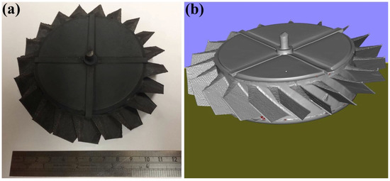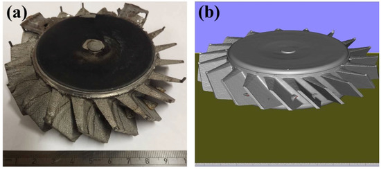 (a) The image of the second oversized Fe-tooling SLM/HIP blisk; (b) 3D image of the second oversized Fe-tooling SLM/HIP blisk scanned using a GOM optical 3D scanner.