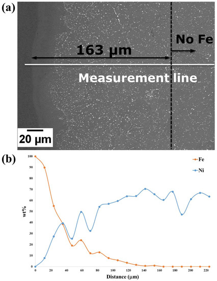 (a) BSE micrograph for the sample cut from the Fe-tooling SLM/HIPped can prior to pickling; (b) EDX line result along the measurement line indicated in (a); it is shown that Fe decreases to ~0 wt.% at around 163 μm.