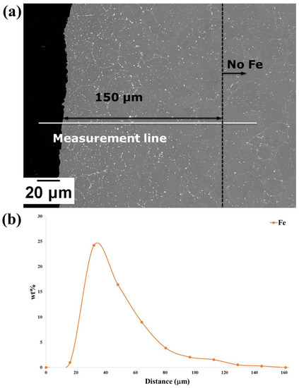 (a) BSE micrograph of the sample cut from the Fe-tooling SLM/HIPped blisk after pickling; (b) EDX line result along the measurement line indicated in (a); it is shown that Fe decreases to ~0 wt.% at around 150 μm.