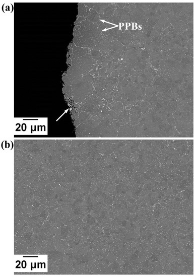 BSE micrographs showing (a) the thinnest part of the blade, where the nonconsolidated area is indicated by the white arrow; (b) further away from the edge of the blade.