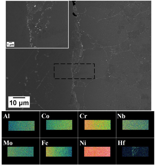 BSE micrographs of the boundary between the IN718 disk and the HIPped CM247LC powder, with a higher magnification BSE micrograph in the insert. X-ray maps of various elements are shown below the low magnification BSE.