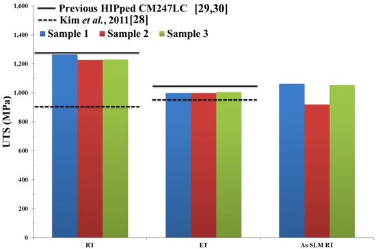 Bar plot showing Ultimate Tensile Strength (UTS) of HIPped CM247LC at Room Temperature (RT) and Elevated Temperature (ET), as well as SLM-processed CM247LC at RT for comparison [1]. Properties for conventionally cast and heat treated CM247LC are represented by the dashed line [28] and previous results of HIPped CM247LC undertaken in AMPLab by the solid line [29,30].