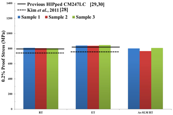 Bar plot showing 0.2% proof stress of HIPped CM247LC at RT and ET, as well as SLM-processed CM247LC at RT for comparison [1]. Properties for conventionally cast and heat treated CM247LC are represented by the dashed line [28] and previous results of HIPped CM247LC undertaken in AMPLab by the solid line [29,30].