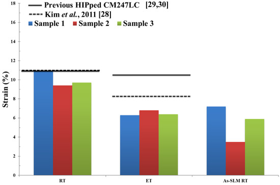 Bar plot showing % strain to failure of HIPped CM247LC at RT and ET, as well as SLM-processed CM247LC at RT for comparison [1]. Properties for conventionally cast and heat treated CM247LC are represented by the dashed line [28] and previous results of HIPped CM247LC undertaken in AMPLab by the solid line [29,30].