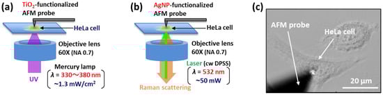 Experimental setups for (a) cell membrane perforation based on a highly localized TiO2-mediated photocatalytic oxidation, and (b) intracellular tip-enhanced Raman spectroscopy (TERS) imaging of molecular dynamics in living cells. (c) Optical microscopy image showing an example of insertion tests or intercellular imaging for a living HeLa cell conducted using the atomic force microscopy (AFM) system after the penetration of the cell membrane using a TiO2- or AgNP-functionalized AFM probe.