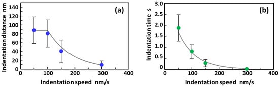 Figure 3 shows the effects of indentation speed on indentation distance and time, which correspond to the moving distance of the AFM tip downward and the elapsed time while in the constant force region (denoted by CFR in Figure 2), respectively. Table 1 presents the detailed numerical data (the mean values and their standard deviations). The probability that the constant force region appeared in the force–distance curves obtained at each indentation speed is also presented in the table. As shown in Figure 3a, the indentation distance during maintaining a constant force increased with a decrease in the indentation speed, but it became constant at speeds of less than 100 nm/s. At an indentation speed of 300 nm/s, the probability that the constant force region appeared in the force–distance curves was 55% (n = 20) when cell membrane perforation occurred. However, the indentation distance in the constant force region was estimated to be as small as 10 ± 9 nm, which is equivalent to 40 ± 30 ms in indentation time (see Figure 3b and Table 1). This value for the indentation distance is quite similar to the thickness of the cell membrane (~7 nm) [].