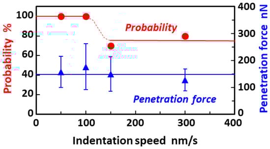Probability of cell membrane perforation and penetration force obtained with a TiO2-functionalized AFM probe under UV irradiation as a function of indentation speed. The vertical bars represent the standard deviation of the penetration force. Note that each point and error bar in the plot of the penetration force represent the mean values and their standard deviations, respectively.