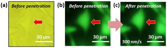 Cell viability after cell membrane penetration was estimated with Calcein-AM (Dojindo Molecular Technologies, Kumamoto, Japan); this dye stains only living cells, and causes the emission of a strong green fluorescence. As shown in Figure 5, a HeLa cell showed intense green fluorescence even after the cell membrane perforation at an indentation speed of 300 nm/s, indicating that the cell was still alive after insertion of the AFM tip. The cell viability was estimated to be 100%; all the cells (n = 8) remained alive after the perforation. Additionally, at an indentation speed of 50 nm/s, cell membrane perforation with a cell viability of 100% (n = 10) was also successfully achieved without significant cell damage. Thus, this technique with a high probability of cell viability after cell membrane penetration may enable a minimally invasive delivery of biomolecules, including DNA, RNA, peptides, proteins, and other various small molecules, into almost any type of cell.