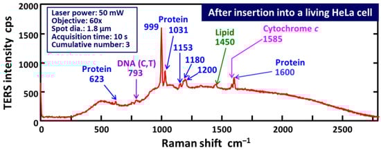 Figure 6 shows a typical Raman spectrum (laser power: 50 mW, acquisition time: 10 s, cumulative number: 3) obtained after AgNP-functionalized AFM tip insertion into a living HeLa cell at an indentation speed of 300 nm/s. In all the experiments, the force–distance curves were measured and verified prior to TERS imaging to confirm that the AFM tip had penetrated the cell membrane, which was confirmed by a drop in force appearing in the force curves (see Figure S2 in the Supplementary Materials). As expected, in Figure 6, the AgNP-functionalized AFM tip successfully enhanced inherently weak Raman signals owing to plasmonic field enhancement [,,]; therefore, the peaks most likely associated with DNA (793 cm−1), proteins (e.g., 999 cm−1), and lipids (1450 cm−1) were clearly observed inside the cell [,,,]. The strong Raman peak at 999 cm−1 can be assigned to the breathing mode of phenylalanine []. Moreover, several Raman peaks (e.g., 623, 1031, 1153, 1180, 1200, and 1600 cm−1) are most likely derived from proteins []. The Raman band located at approximately 793 cm−1 is primarily attributable to the ring breathing mode of nucleic acid bases (cytosine, thymine, and uracil) and DNA backbone (O–P–O symmetric stretch of the phosphodiester bond in DNA) [,]. The peak appearing at 1450 cm−1 is likely attributable to the C–H bending modes of phospholipids [,]. Moreover, this Raman spectrum includes a very interesting and informative peak; it is Raman scattering from cytochrome c (1585 cm−1) that triggers the process of apoptosis []. It is also noted that the intensities of three representative Raman peaks derived from proteins (at approximately 1000, 1200, and 1600 cm−1) increased almost linearly with laser power ranging from 10 to 50 mW (see Figure S3 in the Supplementary Materials).