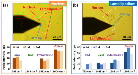 Figure 7 shows a quantitative comparison of the representative peak intensities in Raman spectra obtained from the nucleus and lamellipodia (cytoplasm) of the same living HeLa cell after the penetration of the cell membrane. The Raman measurements were repeated three times under the same conditions in exactly the same position in the cell in order to confirm reproducibility. The Raman spectra obtained are shown in Figure S4 in the Supplementary Materials. As shown in bar graphs comparing the peak intensities of the representative Raman peaks, there was no significant difference between the peak intensities for cytochrome c (1582 cm−1) obtained from the nucleus and lamellipodia. Similarly, a comparison of the intensities of the peak corresponding to proteins (1604 cm−1) also showed no significant difference. On the other hand, the peak for DNA (793 cm−1) appeared significantly stronger in the nucleus rather than in the lamellipodial region of the cell. This most likely reflects the fact that the cell nucleus contains a large quantity of DNA. In contrast, no peak for lipids (1448 cm−1) was observed in the cell nucleus, but it appeared in the lamellipodia. There are probably two main reasons for this. One is that the lamellipodia is a thin and flat cell membrane structure, which consists of a lipid bilayer. The other is that mitochondria contain high concentrations of phospholipids, which are located in the cytosol, but outside the nucleus []. The experimental results prove that the difference between the nucleus and lamellipodia can be clearly distinguished by AFM-based intracellular TERS imaging.