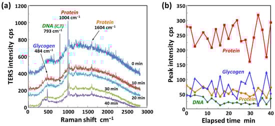 Figure 8a shows a series of TERS spectra obtained inside a HeLa cell at elapsed times ranging from 0 to 40 min after the penetration of the cell membrane. According to the time-dependent changes in each peak intensity shown in Figure 8b, the peaks associated with DNA (793 cm−1) did not change significantly for at least 40 min after the AFM tip had penetrated the cell membrane. In contrast, Raman peaks associated with glycogen (484 cm−1) [] and proteins (1004 cm−1) showed strong temporal fluctuations in peak intensity. This plot suggests that an increase in the peak intensity of proteins may cause a decrease in that of glycogen, and vice versa. Moreover, it should be noted that the increase or decrease in peak intensity for the other Raman signal assigned to proteins (1604 cm−1) followed the same temporal fluctuations of the 1004 cm−1 protein peak intensity. Although the meaning of the negative correlation between glycogen and proteins is still under consideration, the data nevertheless demonstrate that intracellular TERS imaging could allow us to quantitatively study dynamic processes inside living cells.