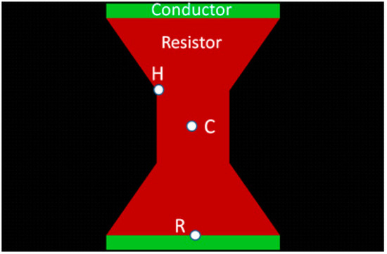 In order to find the balance between these two failure mechanisms, three points of interest are defined, as seen in Figure 1; (C) at the Center of the resistor body; (R) at the center of the conductor–ramp interfaces; and (H) at one of the Hot spots. A certain power level and energy are required to obtain the MB effect [28] at the resistor center (C), but it is preferred that the temperature at (H), the hot spot, will not rise to much above the temperature at point (C). On the other hand, it is preferred that at point (R) the temperature will be as low as possible. Clearly these demands contradict and the goal is to find the optimal compromise that will give the longest lifetime. In order to analyze the points behavior, the electric field magnitude at points (R) and (H) is normalized to the electric field at point (C) as follows: