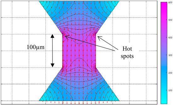 However, improving one failure mechanism caused another one to rise. Despite lowering the gradients over the conductor–resistor transition region, Figure 2 shows the resulting formation of “hot spots” at the corners of the ramp–resistor interface (noted with arrows in the figure). This figure describes the results of the electric field simulation that is developed in the resistor. The simulation was carried out using a MATLAB code, written in the PDE tool. The code solved the Laplace equation in the resistor with Dirichlet boundary condition at the conductor–resistor interface, and Neumann boundary conditions everywhere else. The electric field is noted by the red arrows, together with black solid equal-potential lines. The color reflects the magnitude of the electric field. In these “hot spots” there are local maxima of the electric field and, as a result, local maxima of the current and temperature. These hot spots are extreme in both absolute temperature and in local temperature gradient, and are caused by the rise in current density in their vicinity due to the new geometry. Therefore, the hot spots are the first to be destroyed. Once there is a minor destruction and discontinuity at the hot spot point, the current must bend around it and the effect becomes worse. This leads to a rapidly-developing tear in the resistor towards the other hot spot (this is shown later at the experimental part). A full description of this failure mechanism (simulation and experiment) appears with more details in Einat et al’ research [28], as it was captured on video in a rare instance.