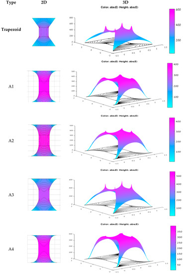 Figure 3 shows the simulation results of the electric field of each configuration. The hot spots singularity is clearly seen in the trapezoid. The reduction of the hot spots’ singularity of the other shapes can be visually compared.