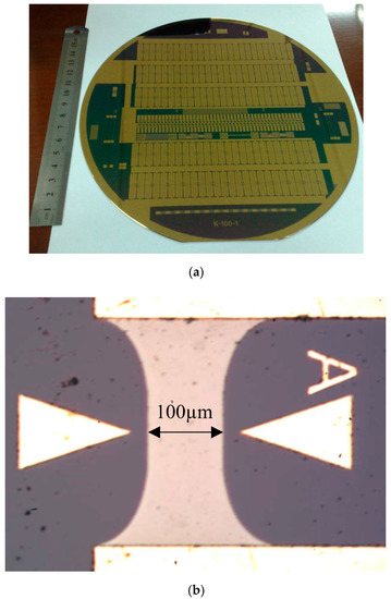 The wafer and one of the planned resistors can be seen in Figure 4a,b. For the purpose of experimental testing of the simulation results, a series of experiments were conducted on the different resistors. The wafer was connected to an electric circuit depicted in Figure 5.