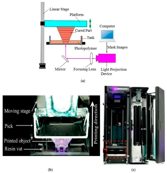 Digital light processing (DLP) is a rapid additive fabrication technology with superior sensitivity. The processing basis of DLP technology is explained in [51,52] and can be briefly abstracted as follows. A commercial 3D printer, MiiCraft 125 (Rapid City, Canada), was utilized in this paper, as shown in Figure 2b.