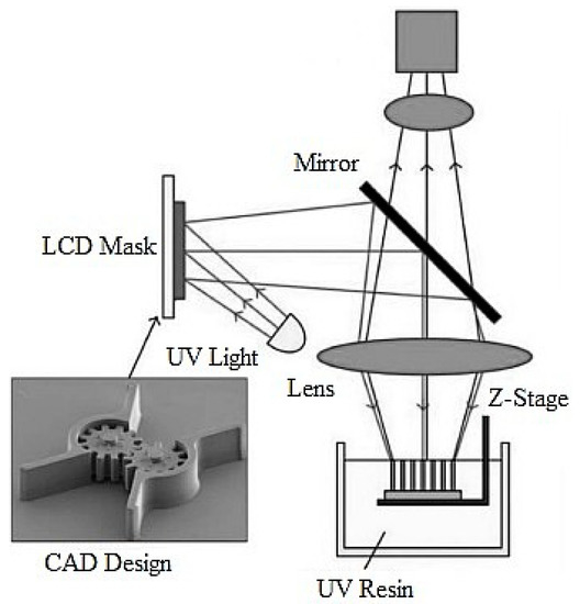 Projection micro-stereolithography (PμSL) is a sophisticated 3D printing method because of its low cost, precision, velocity, and also the variety of the materials such as ceramics, biomaterials, curable photopolymer, polymer, and nanoparticle composites [54]. This method has demonstrated potential in different implementations for example micro-resonators, micro-grippers, micro-optics, biomedical micro devices, micro-fluidics, and so on [57,58,59]. Studies on PµSL are ongoing in terms of the quality and accuracy of the construction process, which affects the production of complex 3D microstructures and makes it attractive enough to be considered for commercial applications [60]. This technology begins by creating a 3D construction via a computer-assisted design program and then transforms the construction into a set of digital mask images. The working basis of PμSL is shown in Figure 3 [61].