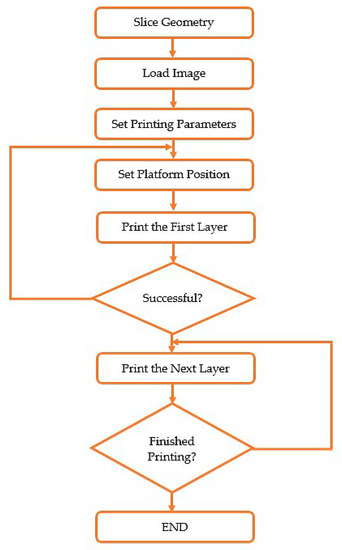 The micro beam shown in Figure 4 was fabricated by a DLP technology-based MiiCraft 3D printing device. 3D printing technology entails an input CAD model of the parts that may be designed in software or obtained from reverse engineering such as 3D scanners. When the CAD model of the micro beam is completed, it is transformed into standard STL format, which is most commonly used to represent 3D CAD models in 3D printing. In an STL file, the CAD model is symbolized using triangular facets, which are described by the x-, y-, and z-coordinates of the three vertices. The step-by-step schema of the 3D printing operation is displayed in Figure 5. The slicer first divides the object into a stack of flat layers, followed by describing these layers as linear movements of the 3D printer extruder, fixation laser, or equivalent. All these movements, together with some specific printer commands like the ones to control the extruder temperature or bed temperature, are finally written in the g-code file, that can be transferred after to the printer.