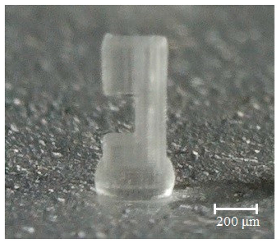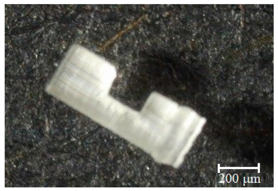 When the support structures are removed, as shown in Figure 7, it is possible to perform the fabrication as the micro beam design can be introduced to the device (a PμSL technology-MiiCraft 3D printer) in two dimensions. An image of the micro beam manufactured with the PμSL is shown in Figure 8. This image was taken with the microscope of the 3D printer device.