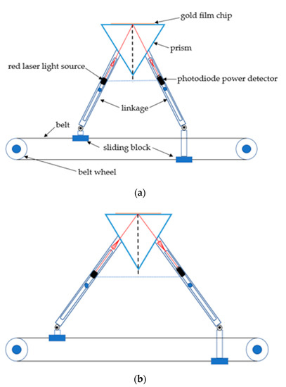 The portable multi-angle scanning SPR sensor includes: a horizontal drive module, symmetrical optics module, and prism and flow cell module. As the motion system of SPR sensor, the horizontal drive module includes a motor, belt wheel, belt, sliding block and guide rail. The two sliding blocks are respectively fixed on the upper surface and the lower surface of the belt. The sliding blocks can generate symmetrical motion along the guide rail under the belt drive. The two sliding blocks drive two linkages on each side of the incident and reflected light. One end of the linkages on each side is respectively fixed on the left or right sliding blocks and the other end is fixed on an axis of rotation as the center of rotation. The two linkages on each side are connected in parallel. The total length of the two linkages can be adjusted automatically so that the linkages of the left and right side produce symmetrical motion. The principle of angle modulation is presented in Figure 1.