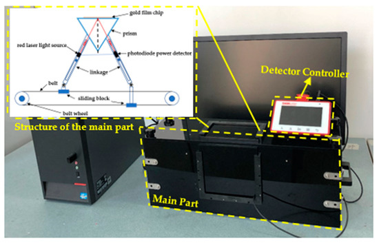 In practice, a glass slide sputtered with metal (usually gold) was attached to the top surface of a prism with matching oil. Then, the flow cell was balanced on the glass slide through the pressure structure. In order to prevent the interference of natural light, the sensor was designed with a light-proof structure. The overall size of the SPR sensor is 480 mm × 150 mm × 180 mm, and the total weight is 3.09 kg. The prototype SPR instrument is presented in Figure 2.
