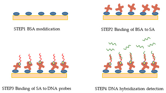 In this experiment, the fixation of DNA probes was mainly divided into two steps. The first was to bind SA to the BSA on the chip surface. The second step was to fix the DNA probes sequence on the SA molecules. Although this method was complicated, it could make the probe molecules stand upright on the surface of the gold film, which was more conducive to hybridization. Moreover, due to the molecule size of BSA and SA, the probe hybridization sites were further from the chip surface. This effectively reduced the steric hindrance between the target sequence and the gold film, which also facilitated the hybridization reaction [35].