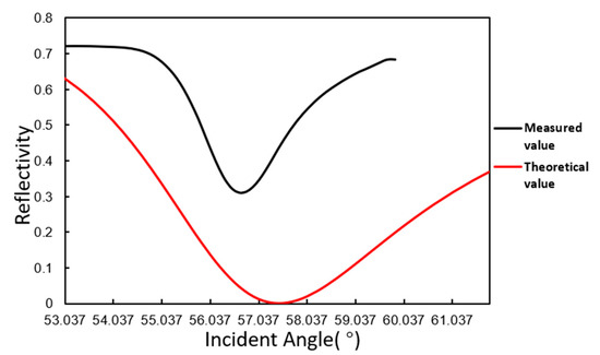 The angle scanning test of the SPR sensor developed in this paper was performed. The measured value of deionized water was compared with the theoretical value of the SPR angle. The comparison result is shown in Figure 4. In the figure, part of the scan curve is only intercepted.