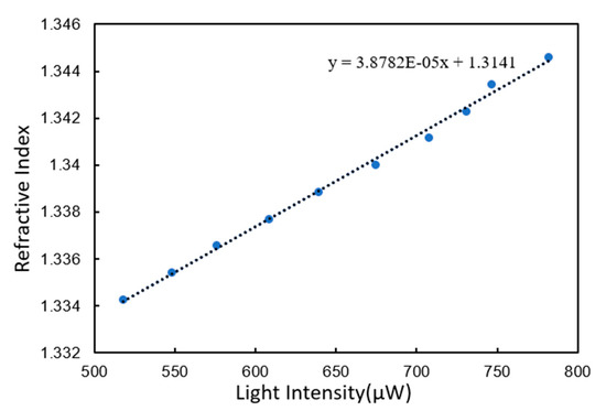 The curve was linearly fitted with linear correlation coefficient 0.994. The slope of the fitting curve was 4.4626 × 10−5. Similarly, the noise was calculated using 500 measurements of deionized water. The variance of the 500 points was 1.4382 × 10−2. Similarly, the refractive index resolution was calculated to be 1.9254 × 10−6 RIU.