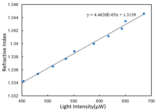 The test was performed on an unmodified gold film chip. One hundred light intensity measurement data of glycerol at each concentration were selected to calculate the average light intensity. The calculated average light intensity was used as the abscissa, and the refractive index corresponding to each concentration of glycerol was used as the ordinate. Ten coordinate points can be obtained from No.1–No.10 glycerol. The linear regression curve of these 10 coordinate points is shown in Figure 5.