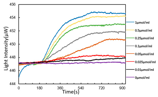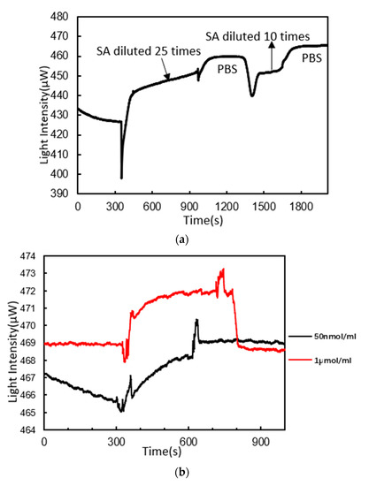 The fixation of DNA probes was the key operation of this experiment to accurately detect nucleic acid. The first step in the fixation of DNA probes was to perform the binding of SA to BSA on the chip surface. The reaction curve is illustrated in Figure 7a. First, SA diluted 25 times with PH4.5 sodium acetate was injected. The light intensity curve started to go up gradually. Ten minutes later, the curve still showed an upward trend. PBS buffer solution was then injected for 6 min. The curve did not decline significantly. This indicated that SA had been bound to BSA. The curve increased by 33 μW after the reaction. SA diluted 10 times with PH4.5 sodium acetate was then injected. The curve increased by only 5 μW. The increase was not as obvious as before. This indicated that the fixed quantity of SA molecule was close to saturation.
