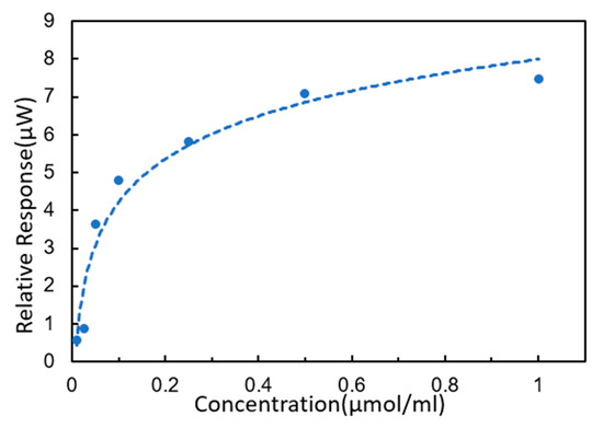 According to the principle of complementary base pairing, single-strand DNA would be detected by DNA probes fixed on the chip surface. The sequence to be detected was 5′-AGTATGGGCATTAGCACCAAAGGGTAGAAA-3′. The reaction curves of DNA hybridization are shown in Figure 8. We started by injecting PBS buffer solution continuously for 3 min, and then started to inject the target solution after the curve was stable. When the target solution was injected, the curve showed an upward trend. The higher the concentration was, the faster the curve went up. The rising speed of curve of target solution (1 μmol/mL) was the fastest and the curve of the target solution (0 μmol/mL) remained stable all the time. In particular, the curves of the target solution at 0.25, 0.5 and 1 μmol/mL showed an exponential rise. The target solution was continuously injected for 9 min, and then all curves tended to be stable. After PBS buffer solution was injected for 3 min, these curves did not decline significantly. This indicates that the target DNA hybridized with the detection probes. Moreover, the higher the concentration was, the higher the reaction signal was, indicating that more target sequences were bound to the DNA probes fixed on the chip surface. Obviously, it showed that the SPR sensor in this paper was sensitive to changes in target solution concentrations from 0.01 to 1 μmol/mL. The response standard curve of the target sequence solution is shown in Figure 9.